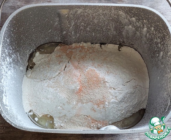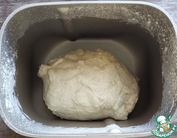 Замесить тесто. Тесто накрыть полотенцем или пищевой пленкой и оставить на 40 мин. в теплом месте для увеличения в объёме. Я оставляю в хлебопечке.