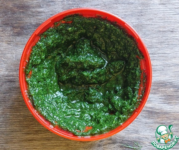 Далее поместить укроп в блендер, добавив 1 ст. л. оливкового масла. Измельчить до однородной массы. По желанию, можно добавить ещё 1-2 зубчика чеснока.