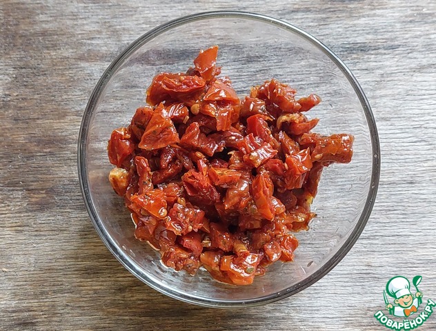 Вяленые томаты мелко нарезать. Мне удобнее нарезать их не ножом, а ножницами.