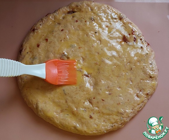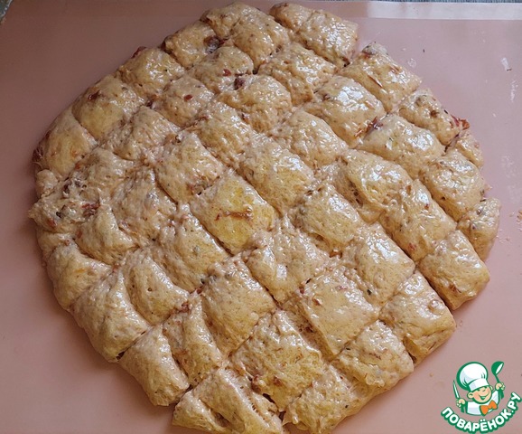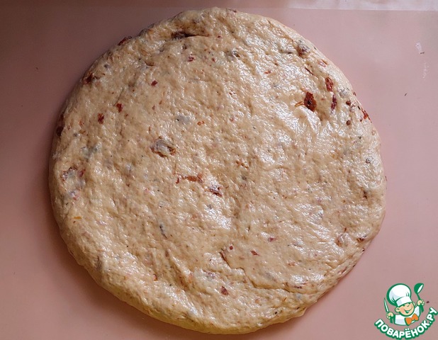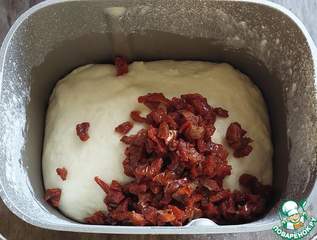 Когда тесто поднимется, добавить к нему нарезанные вяленые томаты. Ещё раз вымесить, при необходимости добавить муки.