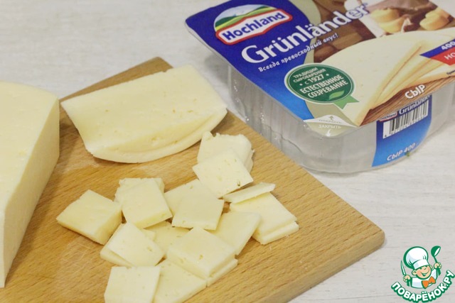 Сыр нарезать на маленькие квадратики.