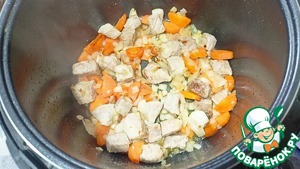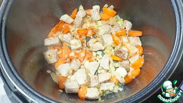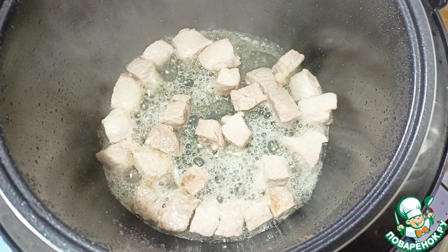 Отправляем в чашу масло и свинину — Режим «Жарка» 10 минут (Не забываем перемешивать каждые 2-3 минуты. Для появления "корочки" желательно жарку проводить с открытой крышкой).