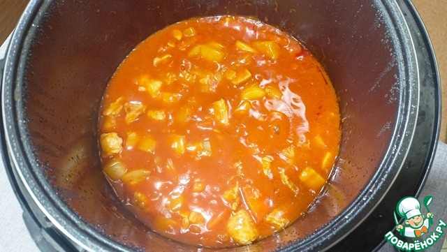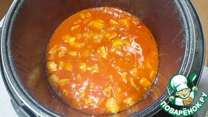 Добавляем в чашу кабачки, пасту, воду, муки и специи - Режим "Тушение" 50 минут.