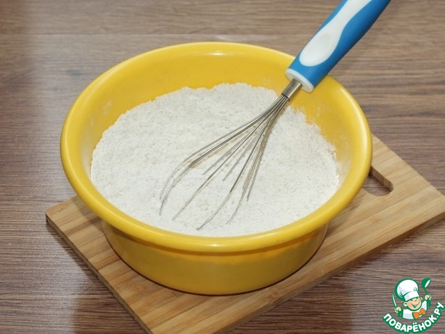 3. Приготовим тесто. В оставшейся теплой воде растворяем соль. Добавляем 1 ст. л. растительного масла и небольшими порциями просеиваем муку.