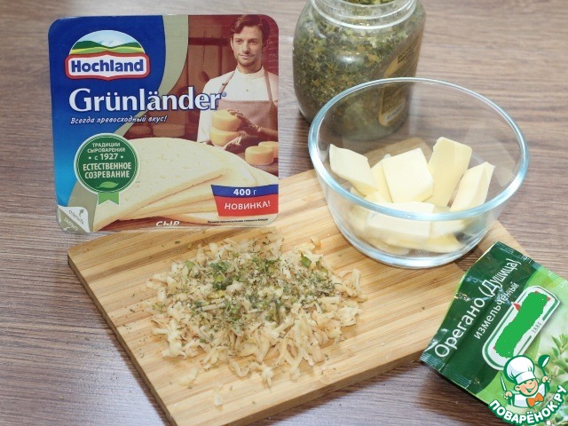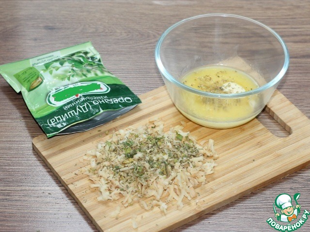 8. Растапливаем сливочное масло и смешиваем с сыром. Добавляем приправу: орегано, карри + сухой чеснок и лук.