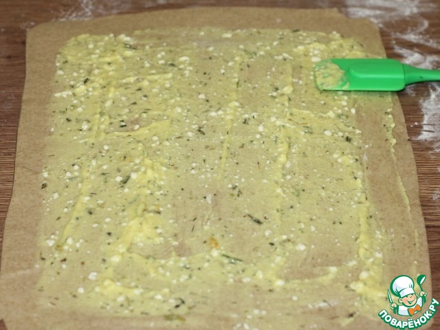 11. Скатываем пласт теста в рулет. При каждом обороте, рулет (внутри от середины рулета до края) приминаем пальцами.