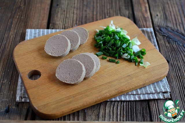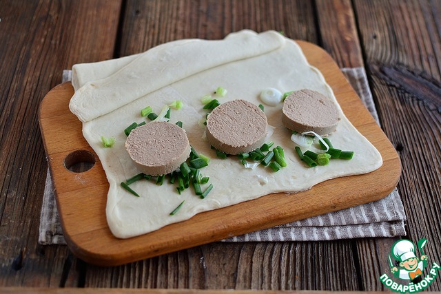 Ливерную колбасу порезать кружочки, по количеству пирожков. У меня 6 штук. Лук нашинковать.