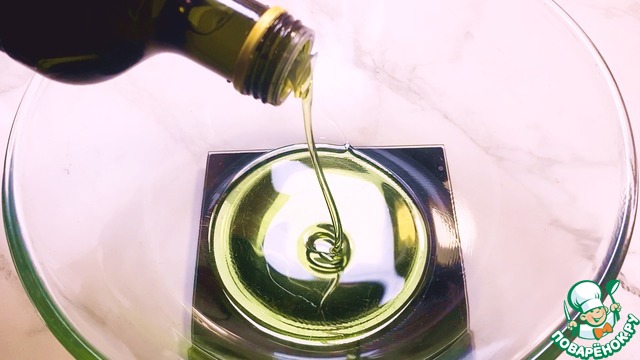 • Первым делом готовим тесто. Для этого в емкость, в которой будете замешивать, отправляем оливковое масло.