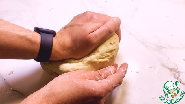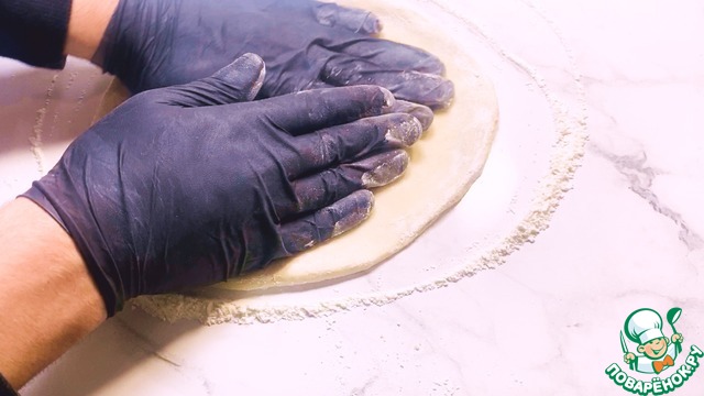 • После чего тесто растягиваем при помощи рук, но можете использовать и скалку.