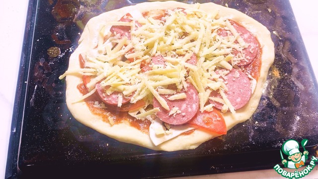 • На тесто выкладываем соус, шампиньоны, томаты, колбасу, сыр.
