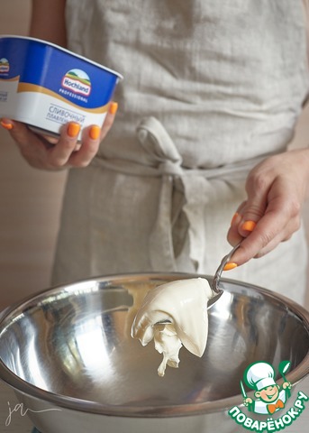 Смешать теплый плавленый сыр (немного подогреть баночку в горячей воде).