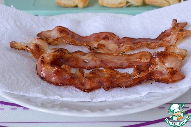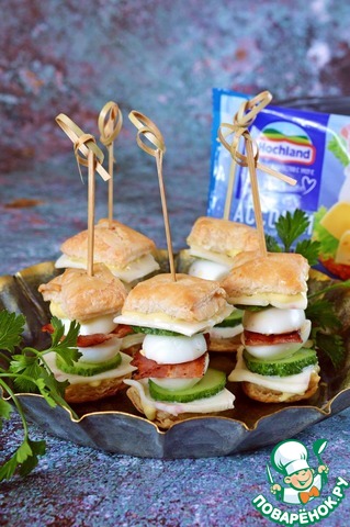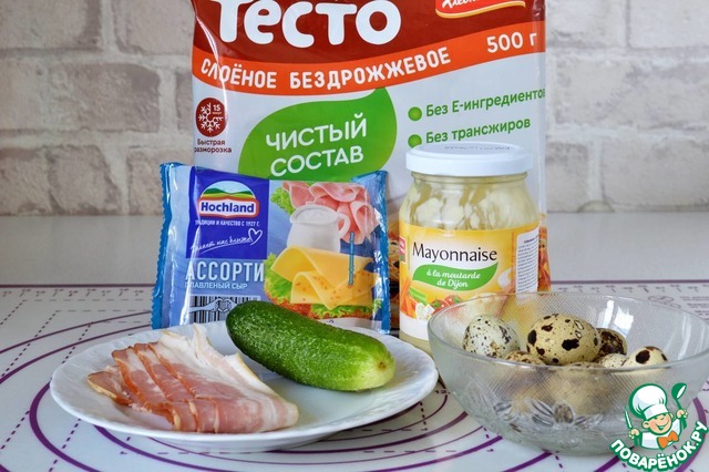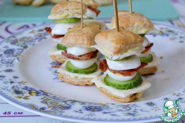 Нижний слой теста смазать каплей майонеза, выложить ломтик плавленного сыра, затем ломтик огурца, далее - яйцо с беконом, ломтик огурца, затем опять ломтик сыра, накрыть верхним слоем слоеного теста, смазанного каплей майонеза. Скрепить конструкцию шпажкой. -