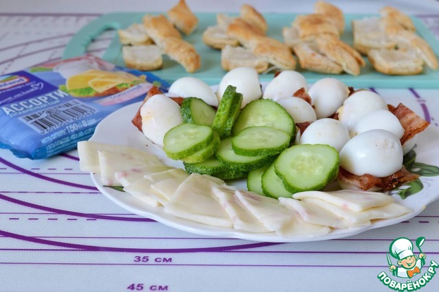Каждое перепелиное яйцо разрезать вдоль пополам, вложить внутрь кусочек жареного бекона. Огурец нарезать кружочками, плавленный сыр нарезать на квадраты, примерно одинакового размера со слоеными "подушечками".