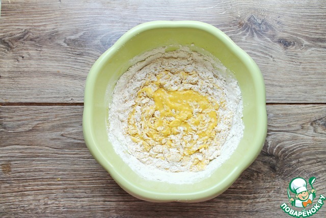 • Муку смешайте с разрыхлителем и просейте в миску со смесью. Тщательно перемешайте до однородного, как густая сметана, теста.