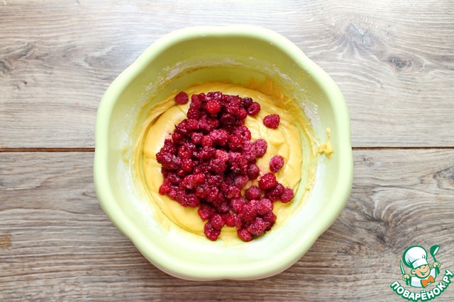 • Положите в тесто ягоды малины и перемешайте. Если ягоды все таки не сухие, обваляйте их в крахмале, чтобы убрать лишнюю жидкость.