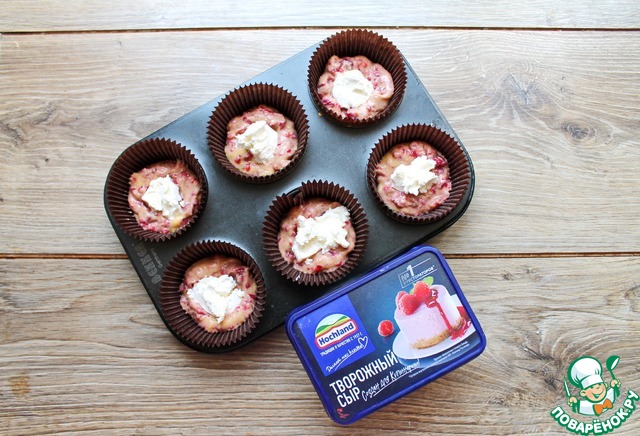 • В форму для маффинов положите бумажные формочки для выпечки. В них положите тесто на 1/3 высоты формы. В серединку положите творожный сыр.