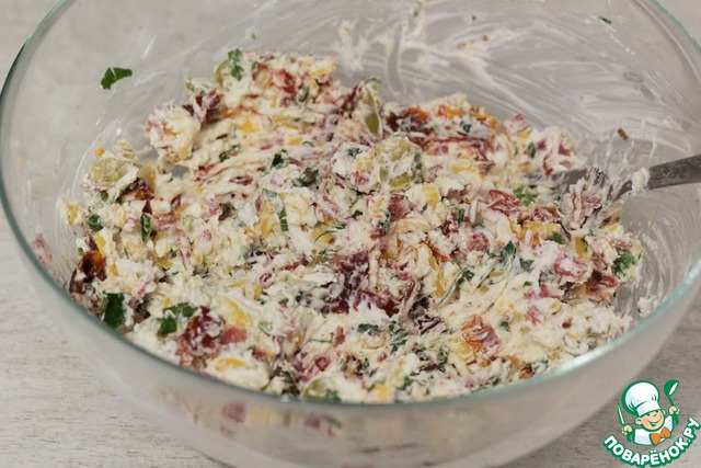 2) Как я уже написала выше, можно использовать начинку в качестве намазки, а можно сделать из нее сырный шар. Для этого после приготовления нужно будет убрать начинку в холодильник на 1-2 часа, затем сформовать из нее шар и обвалять в измельченной зелени или орехах, крекерах, кунжуте... За час до подачи шар нужно будет вынуть из холодильника, чтобы он согрелся.
