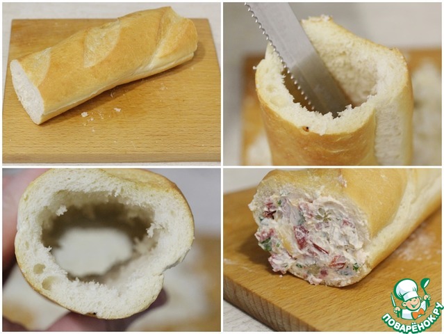 Нафаршированные багеты завернуть в пищевую плёнку и убрать в холодильник минимум на 2 часа. -