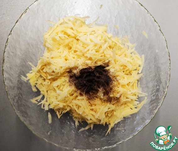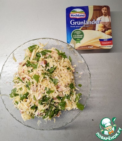 И натираем на терке сыр. Примерно по 25 г на порцию. Сыр можно брать любой. Но сыр Грюнландер отлично подошел к моему блюду.