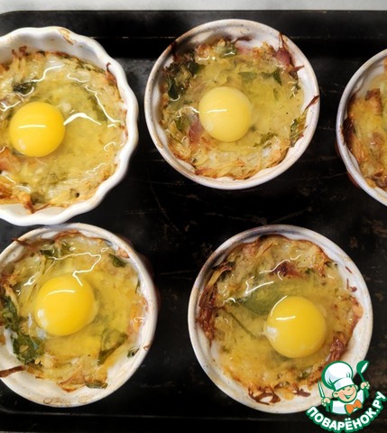 Выпекаем около 20 минут. Затем в каждую форму выбиваем по яйцу и запекаем несколько минут до загустения белка. Желток нам нужен жидкий.
