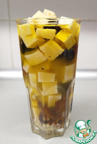 Для начала замаринуем сыр. Для этого нарежем его небольшими кубиками.