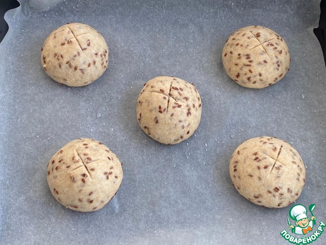 Через полчаса на каждой булочке сделайте надрез, слегка сбрызните водой и поставьте в разогретую до 180 - 190* духовку. Выпекайте булочки в течение 30 - 40 минут ( ориентируйтесь на свою духовку)