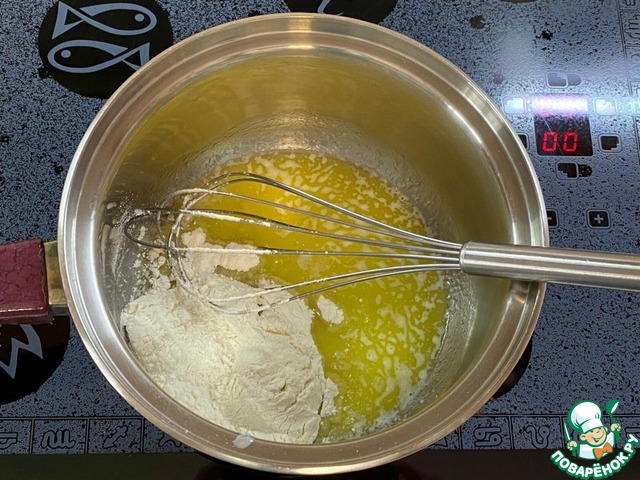 В сотейнике, на среднем огне, растопите сливочное масло и всыпьте 2 ст. л. муки. Перемешайте до однородной кашицеобразной массы.