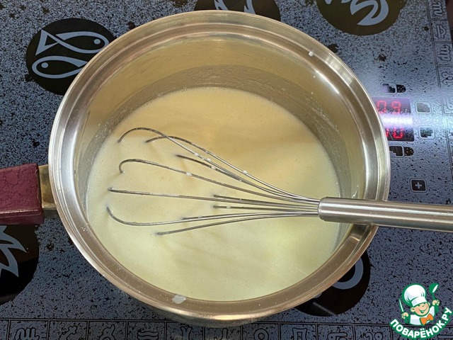 Затем влейте молоко и снова перемешав до однородности, поставьте на огонь. При постоянном помешивании, доведите молочную смесь до загустения. ( густота - как тесто для оладьев)