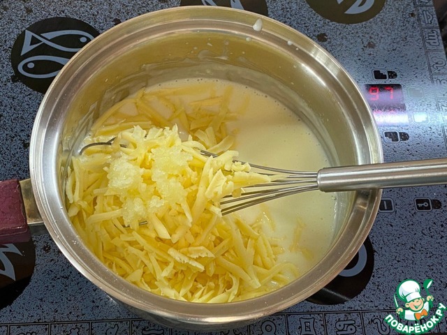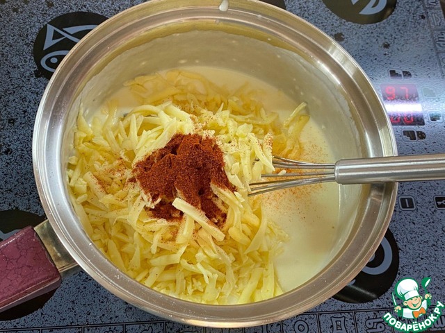 Всыпьте остальную часть натертого сыра и добавьте копченную паприку. Смесь перемешайте до однородности и снимите с огня.