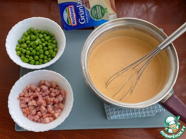Смешайте горошек и грудинку с сырным соусом, посолите и поперчите по вкусу. -