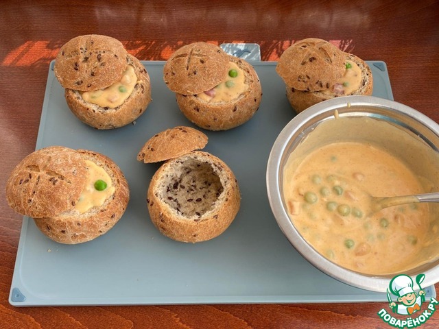 Готовые булочки остудите, срежьте верхушку и удалите мякиш, чтобы получилась чаша. (мякиш можно подсушить и получатся отличные сухарики для супа)