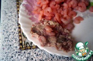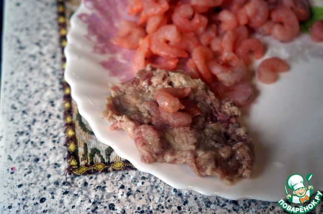 На лепешку из фарша в центр выкладывать креветки (от одной до трех – зависит от того, какой величины шарики вы будете лепить).
