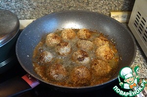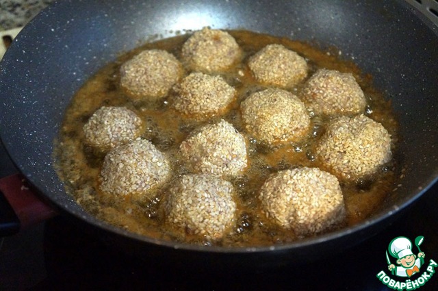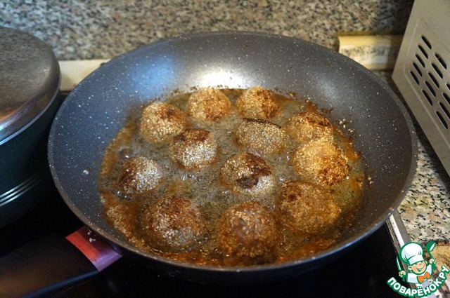 В воке или просто глубокой сковороде разогреть масло до дымка, окунать шарики, жарить на сильном огне, поворачивая.