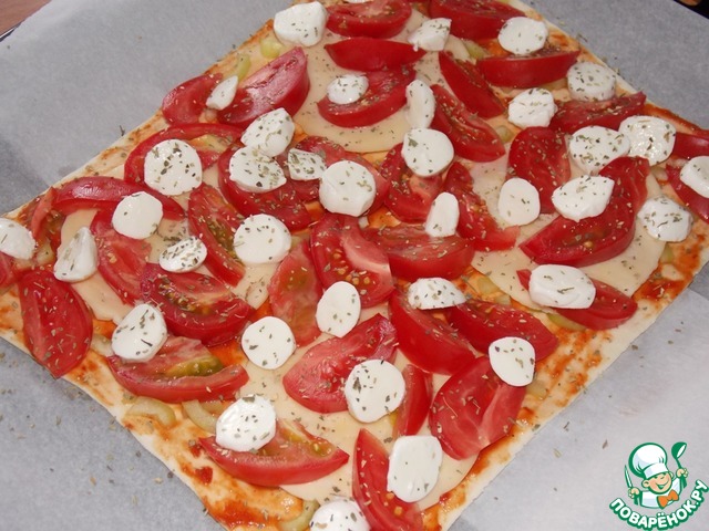 Сверху разложить моцареллу (каждый кусочек разрезать) и посыпать сухим базиликом. Выпекать при 180С, примерно 10-15 минут, ориентируйтесь на свою духовку.