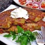 Готовую запеканку подаём горячей. Запеканку D-20 см нужно нарезать на куски и разложить всем по тарелкам. Я сегодня сделала только себе на сковородке D-15 см. Поэтому не резала. Очень вкусно есть её с помидором и малосольными огурцами. Даже мяса не нужно никакого. Вполне себе самостоятельное блюдо.