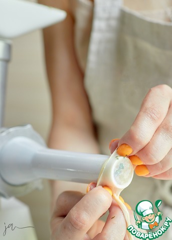 Надеть на носик колбасного шприца череву.