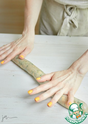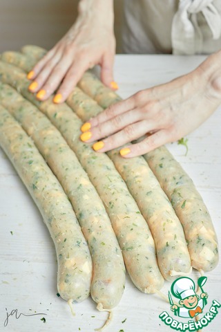 Покатать колбаской по столу для более равномерного распределения фарша.
