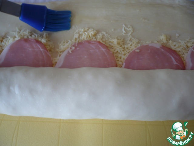 Готовое тесто выложите на рабочий стол и раскатайте его скалкой в пласт прямоугольной формы. По всей поверхности пласта распределите предварительно натертый сыр Грюнландер ТМ "Hochland".