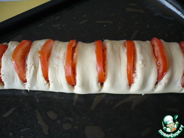 Противень застелите бумагой для выпечки и смажьте растительным маслом, выложите на него приготовленный рулет. Острым ножом на рулете сделайте надрезы и положите в них ломтики помидора.