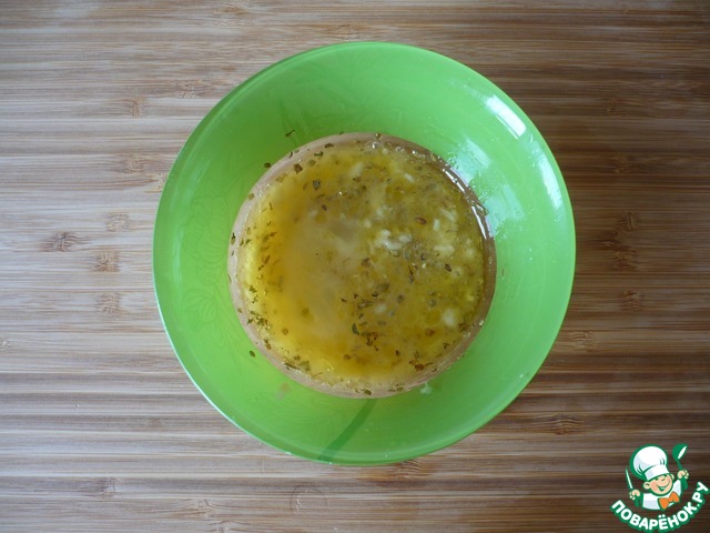В миску со взбитым яйцом добавьте измельченный зубчик чеснока, соль, оливковое масло, орегано. Все хорошо перемешайте.
