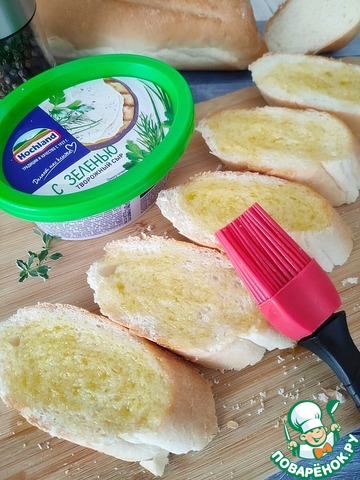 Нарежьте багет. Одну сторону смажьте оливковым маслом.