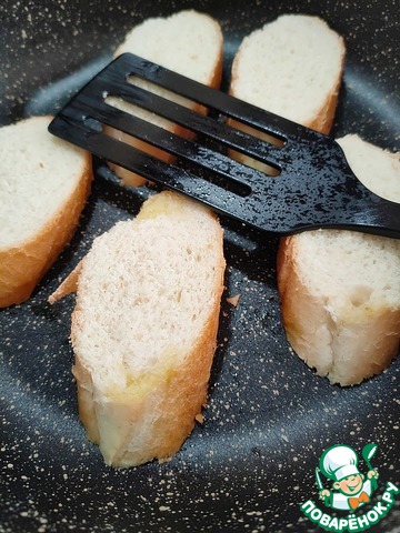 Этой стороной выложите кусочки багета на сковороду. Хорошо поджарьте, прижимая их слегка кулинарной лопаткой. Но жарьте только с одной стороны.