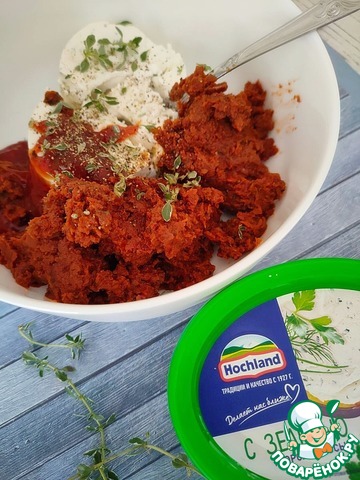 В чаше соедините вяленые помидоры, сливочно-творожный сыр и кетчуп с соусом. Добавьте соль, свежемолотый перец и листики тимьяна. Всё хорошо перемешайте.
