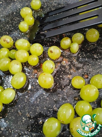 Этим временем раскалите сковороду с маслом от вяленых томатов. Обжарьте на нём виноград, примерно 2 минуты.