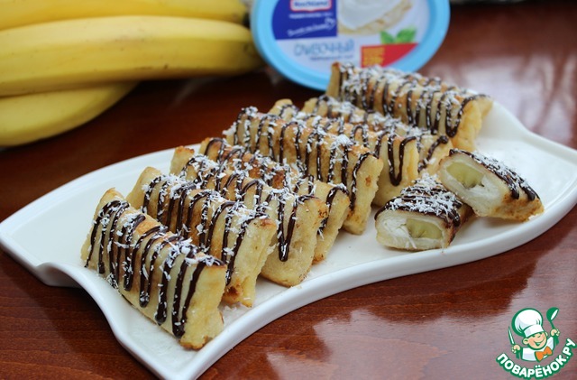 А хлеб лучше конечно взять тостовый...он очень мягкий и раскатывается лучше...мне снова заказали партию этих пирожулек...все необходимое принесли и бананы, тостовые хлебцы и шоколадку