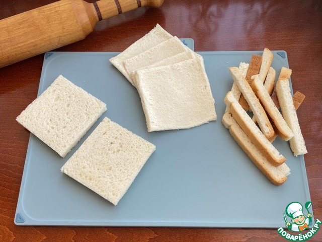 С ломтиков тостового хлеба, срежьте со всех сторон корочки. Хлеб тонко раскатайте скалкой.