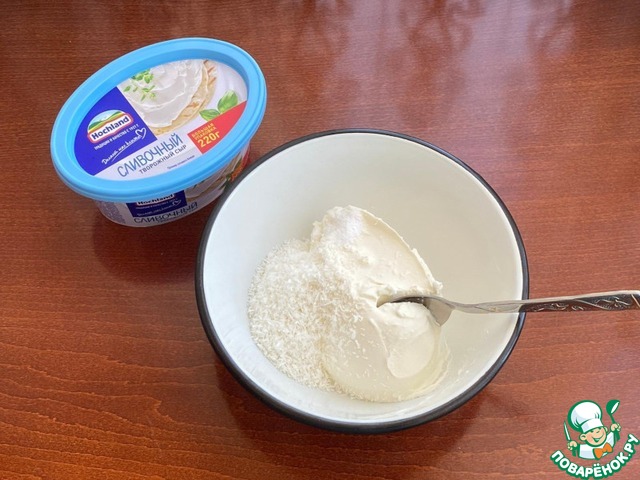 Сливочный сыр смешайте с кокосовой стружкой и щепоткой ванилина.