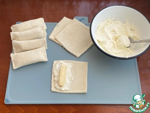 Одну половину раскатанного хлебного ломтика смажьте сырно- кокосовой начинкой ( 1 ч. л. )и положите на нее кусочек банана.