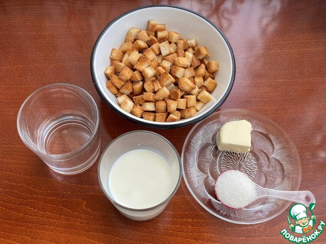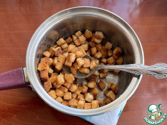 Хлебные корочки нарежьте на небольшие кубики и подсушите в духовке. -