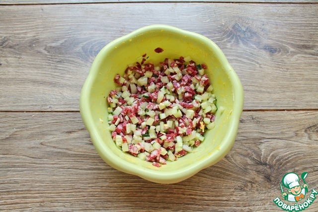 С миску положите порезанную мелким кубиком колбасу и свежий огурец. У перца удалите плодоножку, перегородки и порежьте мелким кубиком. Добавьте в миску с колбасой и огурцом, перемешайте.
